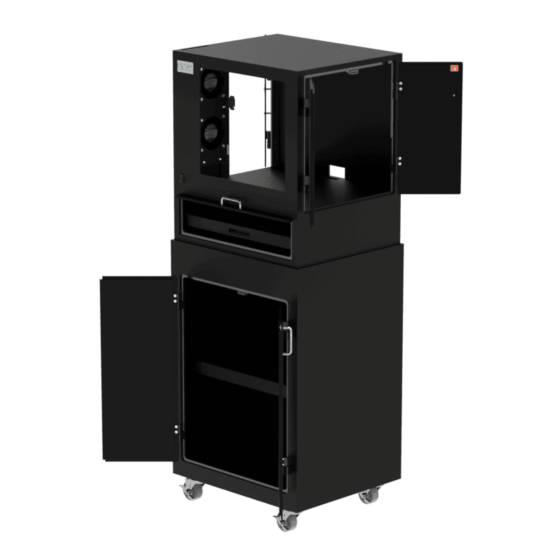 The DFP320MKS series of environmental mobile workstations act like a mini clean-room keeping airborne debris from entering and damaging your mission critical computer hardware. Our NEMA style, dual-fan, positive pressure enclosures are the most user friendly on the market. The DFP320MKS series is one of our most versatile computer workstations and can be customized for any application. Standard configurations for monitors from 15″ to 27″. Also available for touchscreen monitors. Our industrial tough ABS construction works great with wireless networks.