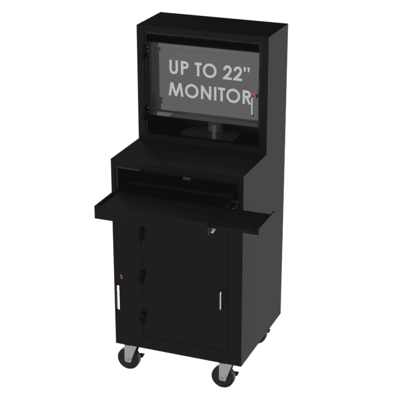 The DFP350F mobile Industrial Computer Workstation enclosure, works like a mini clean room keeping airborne debris from entering and damaging your mission critical computer hardware. The workstation can hold up to a 22″ flat screen monitor in the top cabinet. The lower cabinet comes with a removable shelf and can hold up to a 15″W x 20.5″D x 21″H PC. Our NEMA 12, dual-fan, positive pressure enclosures are the most user friendly on the market featuring easy access to equipment and can be built to accommodate PC’s, Servers and Peripherals. Our industrial tough ABS construction will work seamlessly with wireless networks. Air-conditioned versions of this workstation are available.