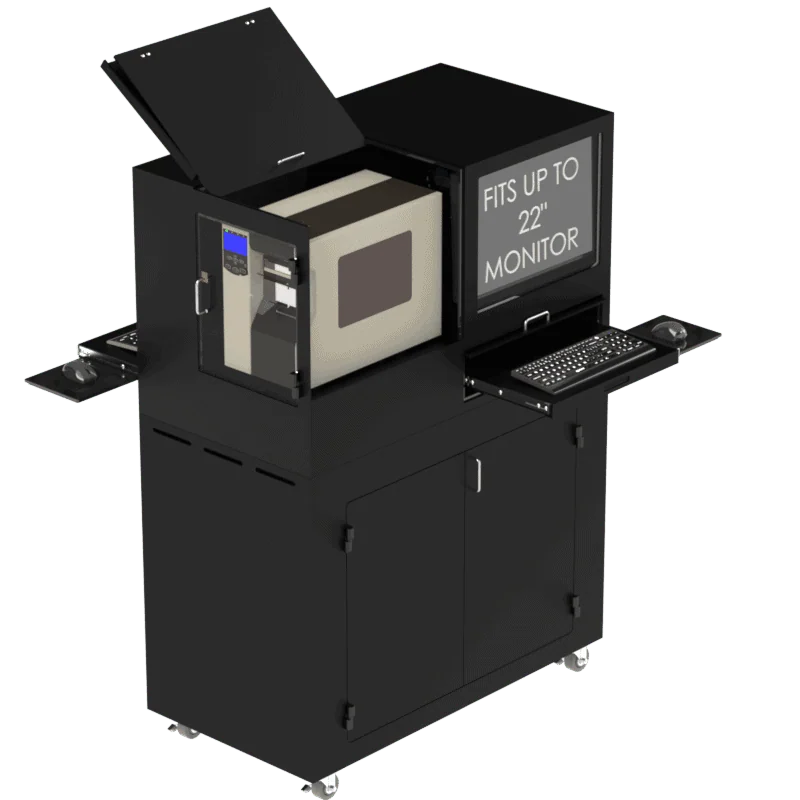 This mobile computer workstation holds two 22″ monitors and has two slide out keyboard trays with a slide out mouse pad. There is room for a PC and a barcode printer. The barcode printer side door has a cutout specific for a Toshiba B-EX4TI printer. We can customize the side door for another barcode printer label slot. It will hold a CUB, Data Max, Epson, GoDex, Honeywell, Intermec, Primera, Printronix, Sato, TXC, Toshiba and Zebra Barcode Printer. There is a bi-fold door that allows you full access to the barcode printer for easy label changes. The bottom cabinet is a large storage area that has a removable shelf. The top and bottom cabinet have their own fan/filter system to keep both cabinets clean and free of debris. The clear acrylic monitor windows are easily replaceable if they get scratched or damaged. This workstation rolls on 3? heavy duty locking casters.