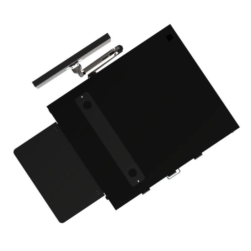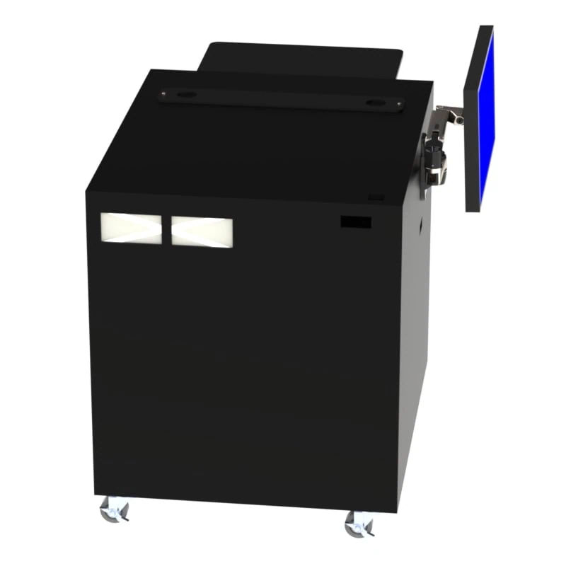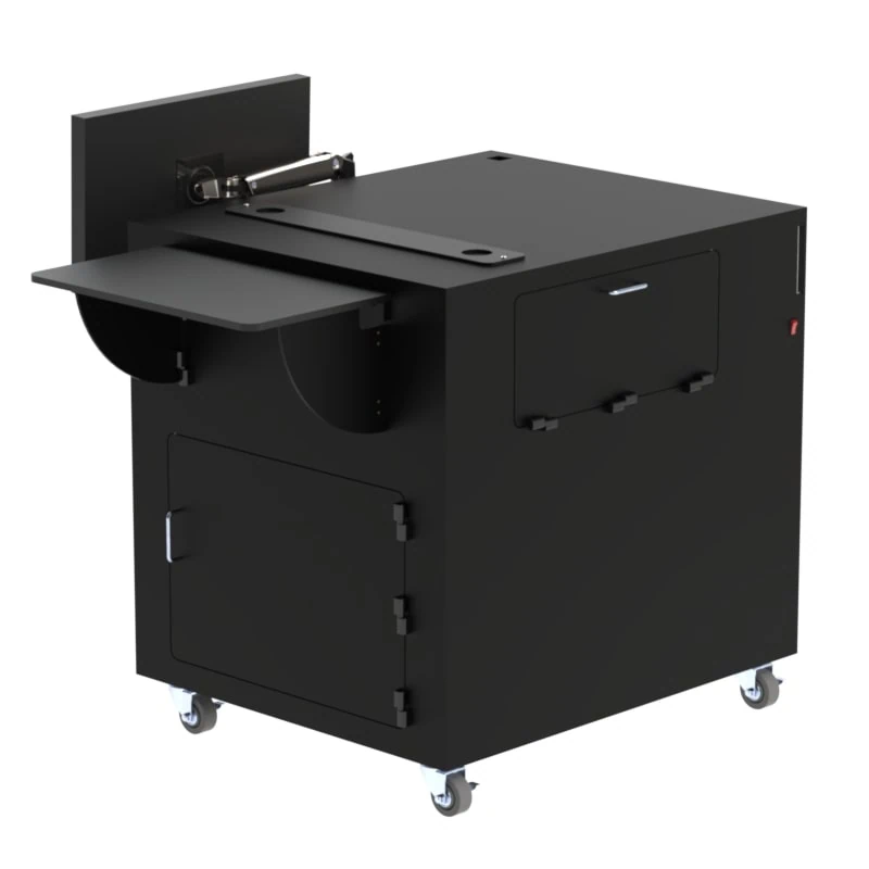 The Dust Free PC Mobile Workstation is a fully integrated, dust-free solution engineered to support the Keyence IM-X1540 Imager along with your control PC, power supply, and monitor—all in one rugged, mobile enclosure. The compartment on the top half of the enclosure is large enough to hold the control pc and a small UPS in a clean air environment. The lower compartment of the enclosure has a 19″W x 29″D x 8″H storage drawer on 24″ drawer slides. The door opening in front of the slide out drawer is 22.75″w X 15″H. The IM stage sits on top of the workstation. The monitor arm and monitor are mounted on the left side of the enclosure. There are three brush covered cable ports for monitor cables, imager cables and power cables. The fan system power cord is inside the enclosure and plugs into the UPS. UPS, Control PC, Keyboard & Mouse, and Monitor are NOT included with the workstation.