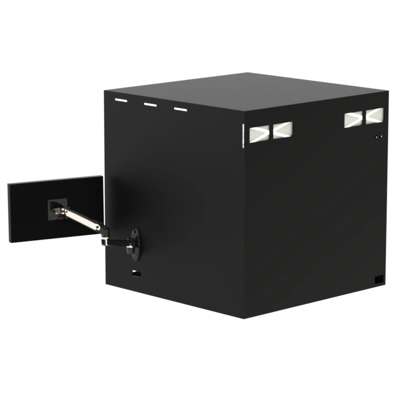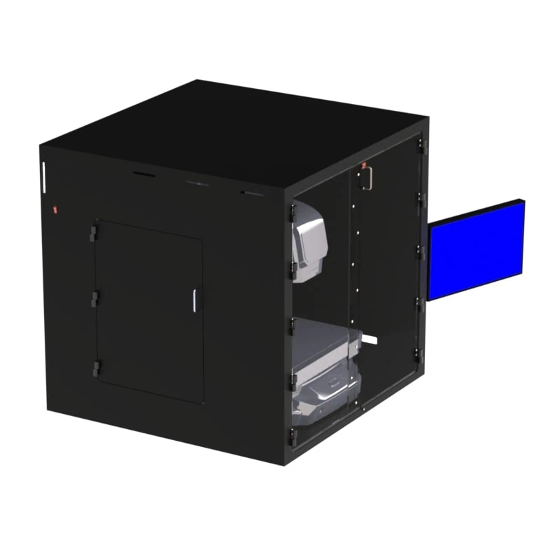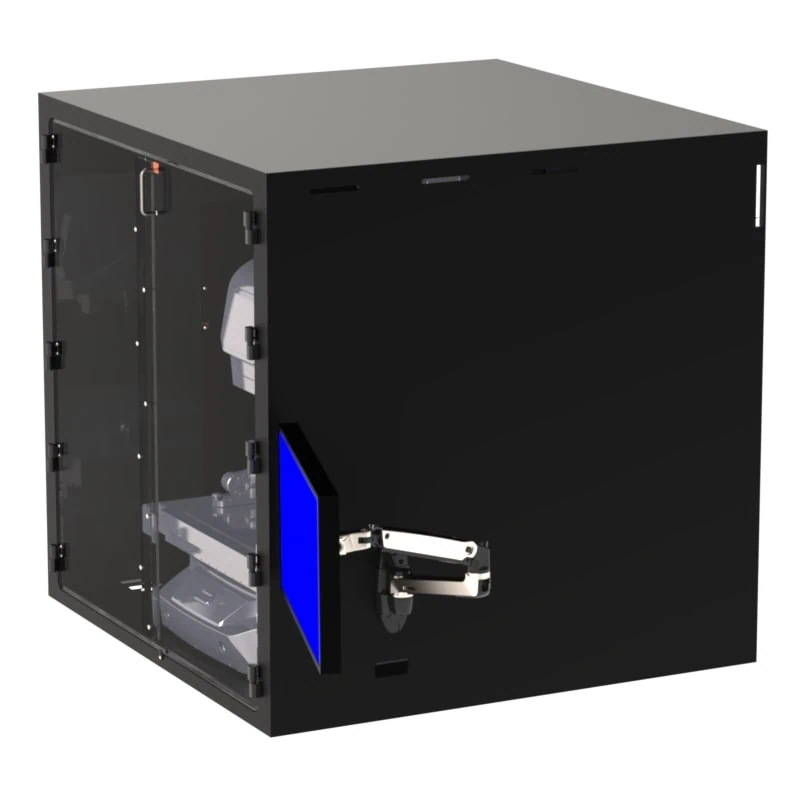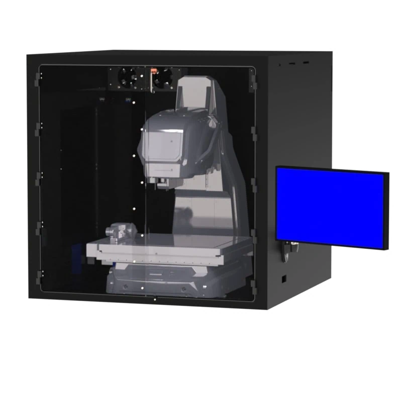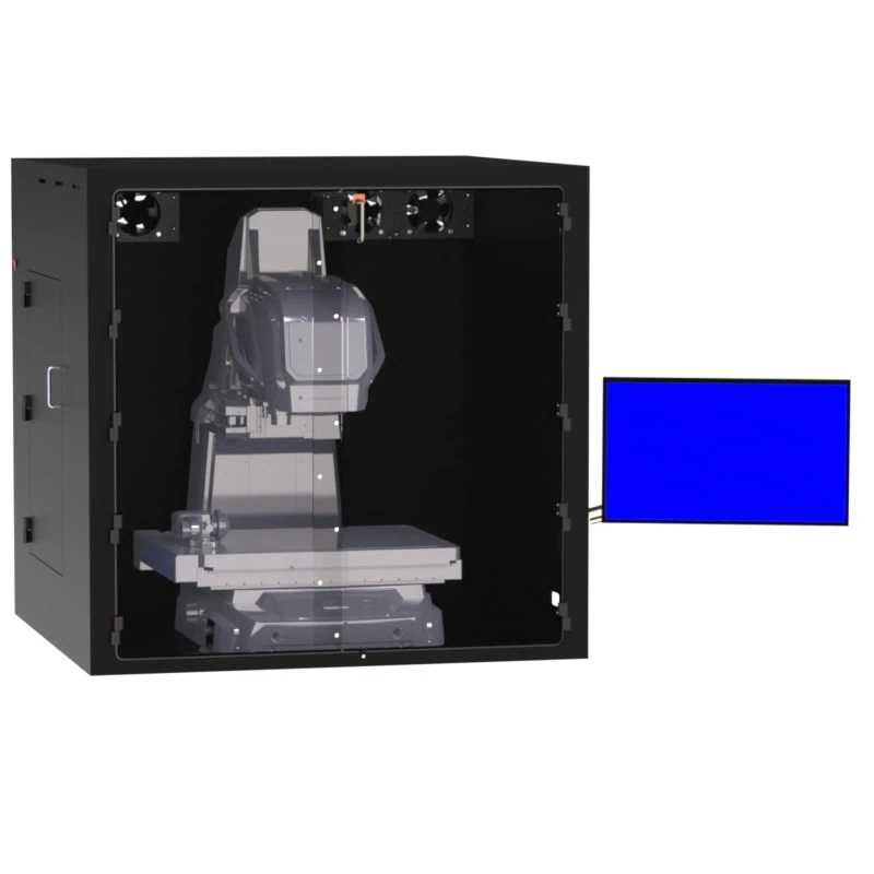 This tabletop enclosure works for the IM-X1540 Stage. You can install either the IM or LM Camera Head on the stage. There is an articulating monitor arm mounted on the right side of the enclosure that can hold up to a 30″ monitor. Dual fan/filter system keeps the enclosure under positive pressure. Large front double door provides easy access to the imager stage. Front doors open from the center and are hinged on the sides. There is a large side door for access to the controller PC and left side of the stage where the connection is for the head to stage wiring. Brush covered cable port for monitor cables.